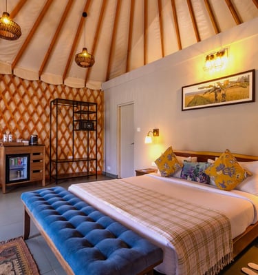 Our Rooms at HAVEN KINGS, Nagarahole are spacious & air-conditioned. Each Tamarind Canopy Luxe Cabin or Planter's Den is private with a separate entrance and all modern amenities.